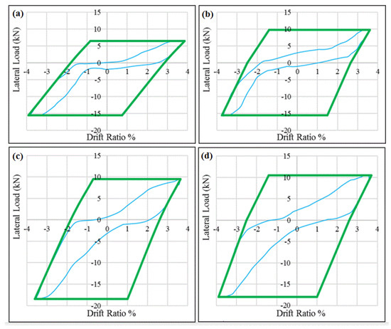 To ensure that the joints have a good damping after seismic action, relative energy dissipation at 3.5% of the drift ratio must exceed 0.125. If the beam–column joint fails to meet this condition, the structure will experience excessive oscillation after a seismic event. The dissipation energy in the cycle represents the elastic–plastic behavior. ACI 374.1-05 stipulates that the energy is calculated from the hysteric curve area at drift ratio of 3.5% (area parallelogram). The parallelogram was created by two horizontal lines and four parallel lines, with first positive stiffness on the upper parallel lines and initial negative stiffness on the bottom parallel lines. Figure 16 shows the calculated relative energy dissipation obtained from the definition of the parallelograms. Table 4 displays the specimens’ relative energy dissipation ratios.