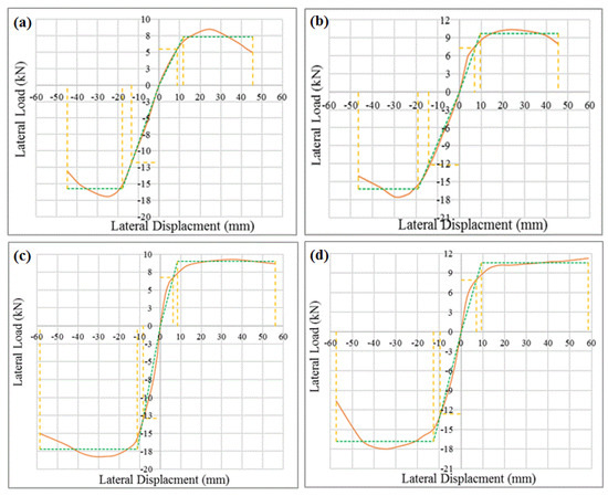 The ideal bilinear drawing demonstrated by Paulay and Priestley and described in Section 3.4 was used to obtain the first yield and ultimate strengths, respectively, from the experimental () and finite element models (). The ultimate strengths from the finite element and experimental model are