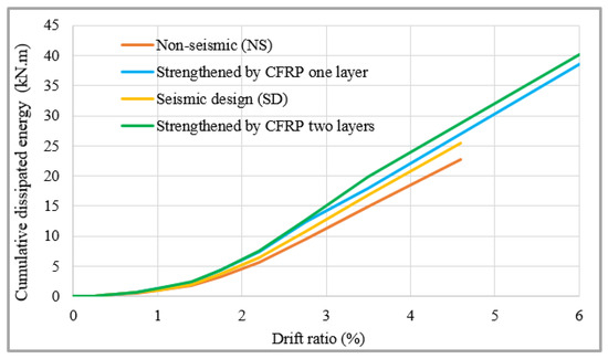 The obtained relative energy ratio values in the table are above 0.125, which clearly shows that the specimens could meet the requirement of the standard. This can be assigned to the design of the specimens that follow the criteria of a weak beam/strong column. Consequently, plastic hinges can occur at the end of beam near joint, making the energy dissipation in plastic hinge region. In addition, transverse joint reinforcement was observed to reduce the joint shear distortion and joint cracks, resulting in higher performance of the specimens made using seismic details compared to the non-seismic specimens. The better energy dissipation obtained in the specimen strengthened by two layers of CFRPC can be ascribed to the increase in the confinement of the joint by double layers of CFRPC integration.