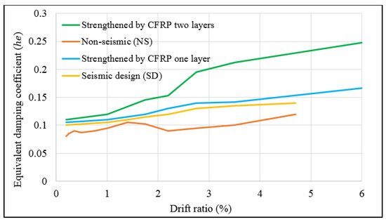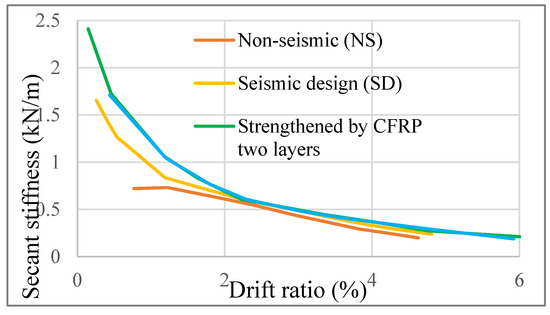 The degradation of the secant stiffness values for all specimens increased with the increase in drift ratio (lateral displacement) at various load steps, significantly impacting the specimens’ stiffness degradation. The stiffness of the specimens was reduced with the increase in the load step. The non-seismic specimen showed lower stiffness than other specimens. Specimen strengthened by two layers of CFRPC showed higher stiffness, since all the specimens had the same value in terms of the beam reinforcement ratio. In essence, the confinement given by the presence of CFRPC to the beam–column joint could mitigate the distortion of the joint panel, hence enhancing its strength and reducing crack formation in the surrounding area. In short, CFRPC-integrated NSCBCJs showed improved performance against seismic events.