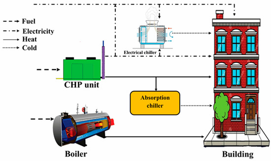 In modeling, it is necessary to create an energy flow diagram that represents the conceptual model of energy flow. The energy flow diagram of the building CCHP system, which has different, possible, and comprehensive equipment and has been investigated in this study, is shown in