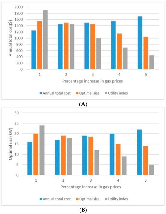 Figure 6 shows the sensitivity of the annual cost, optimal capacity, and usefulness index of CCHP systems in terms of different natural gas prices relative to the current price. In any case, the effect of changes in gas prices on the size of the cogeneration unit is very low.