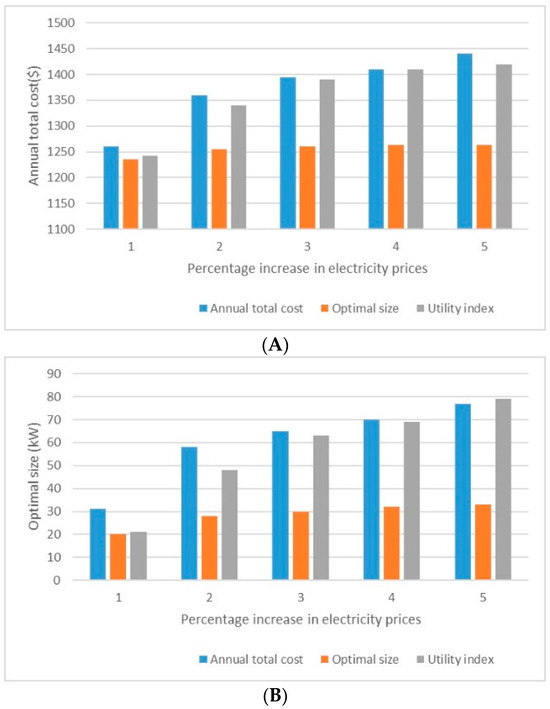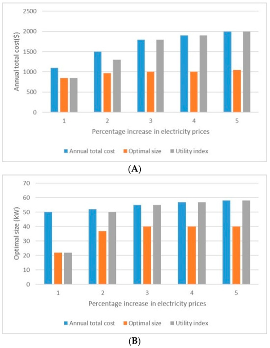 Figure 7 shows the sensitivity analysis of electricity purchase price for the studied demand. This form states that as electricity prices increase, the annual cost increases. It can also be realized that with the increase in electricity prices, the optimal size of the system also increases. Increasing the cost and optimal size is such that it can be seen that the usefulness index also increases greatly.