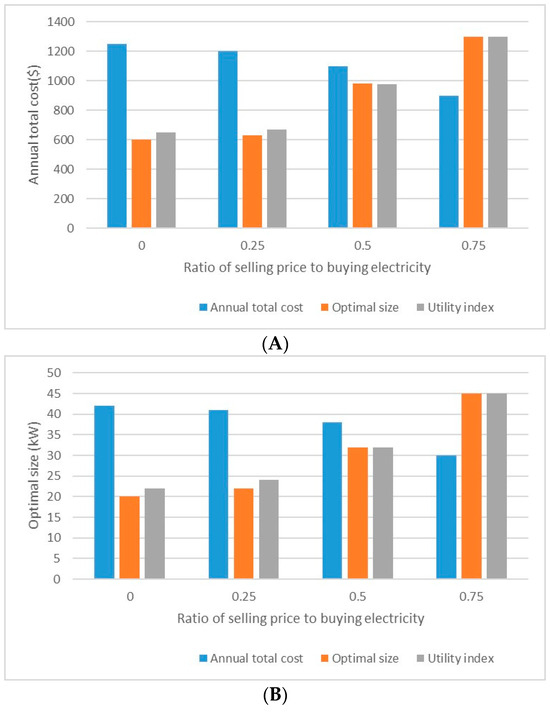 Figure 9, sensitivity analysis of the price of electricity for sale is shown. From the figure, it can be realized that by using the higher price of electricity for sale, annual costs are significantly reduced and the size of the system increases. This is because the increase in the price of electricity for sale makes heat production much more valuable and suitable and the usefulness index increases.