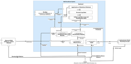 Figure 1 illustrates a component diagram of the WebTraceSense framework. The WebTraceSense framework is contingent upon researchers, web developers, or any individual interested in analyzing user interaction data having access to a website where these logs can be collected. The interaction logs are exported into a JSON file, which captures essential metrics such as click data, key presses, and the latency of the user’s session. The OAuth protocol is employed to streamline the process of user authentication, thereby enabling users to log in using a third-party provider. Upon successful authentication on an external platform, users are redirected to the WebTraceSense frontend. The main webpage provides users with the ability to manage the visualizations of user logs. The generation of these visualizations is facilitated through the utilization of a wizard form, which guides users through a series of steps, including the upload of interaction log files and the selection of metrics to be analyzed. These may include mouse data, key presses, and temporal intervals, as well as the types of visualization charts to be generated. Following the submission of a visualization request, the ‘Visualization Module’ processes it to produce dynamic, data-driven graphics. Subsequently, the backend collates data on the visualization metrics employed, which are then subjected to statistical analysis in order to optimize the visualizations produced. The refined visualizations provide valuable insights that assist in the definition of requirements for researchers, game developers, or web developers to enhance their web platforms. This iterative process of continuous refinement entails the generation of new user interaction logs and the conduct of further analyses. Throughout its operational lifespan, the WebTraceSense project incorporates a DevOps cycle to automate the integration of statistical methods into its data-driven processes. This automation facilitates a seamless transition of backend and frontend components from the development phase to the production environment, with unit and integration tests ensuring efficient and seamless functionality.