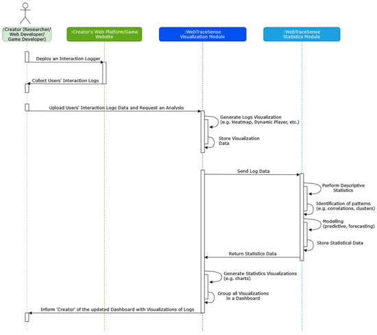 The sequence diagram of the visualization module (see Figure 3) provides a comprehensive overview of the process, which commences when a creator (researcher, web developer, or game developer) requests interaction log data from a particular web platform. This constitutes the inaugural stage in a series of data-driven activities with the objective of creating sophisticated visualizations. Once the log data have been obtained, the creator must then select the type of visualization that is required. This may range from a relatively simple chart to a more complex graphical representation, such as a heatmap or a dynamic visualization of player interactions. The usage of line charts enables the illustration of trends over time, such as the frequency of user interactions or the progression of task completion. This provides a clear, chronological view of user behavior. Heatmaps represent another indispensable visualization instrument within the system, employed to highlight areas of elevated interaction density on the user interface, thereby effectively identifying those locations where users frequently click or direct their attention. This is particularly useful for identifying user interface (UI) elements that are most engaging or, conversely, those that may be causing user frustration. Furthermore, the dynamic player represents an additional interactive visualization option, enabling users to replay sequences of interactions, such as mouse movements and keypresses, in real time or at adjusted speeds. This tool provides an immersive method of analyzing the flow and timing of user actions, offering insights into the user’s navigation patterns and decision-making processes. The aforementioned visualizations, which are powered by D3.js, not only present the interaction data in an accessible and engaging format, but also enable users to interact with the data through filtering, zooming, and panning. This allows for a more in-depth and comprehensive analysis to be conducted.