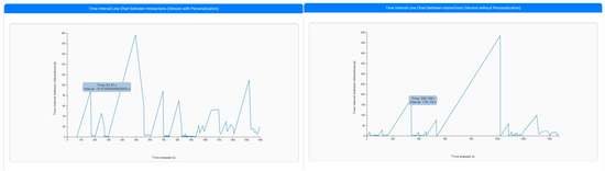 Figure 5 presents a line chart comparing user interaction logs from two versions of a web application, one with personalization and the other without, as documented by Paulino et al. [15]. The chart effectively illustrates the temporal dynamics between user interactions. In the personalized version (left side of the chart), there is a noticeable reduction in the time intervals between interactions, suggesting a smoother and potentially more intuitive user experience. Conversely, the version without personalization (right side of the chart) exhibits longer time intervals between interactions, implying a more challenging user interface that may require more time for users to navigate and complete tasks. This visual representation underscores the efficiency gains that can be achieved through personalized interfaces, aligning with expectations that personalized systems can enhance user engagement and task performance by tailoring the experience to individual user needs.