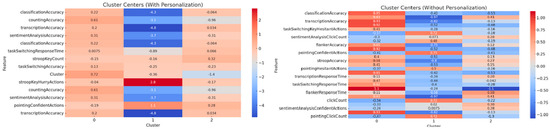 The analysis indicates that personalization is associated with enhanced performance metrics, particularly with regard to accuracy and efficiency (see Table 1). In order to gain a more nuanced understanding and identify patterns, we employed a range of analytical techniques, including the use of correlations, trends, and potential clusters. The following steps were then undertaken: A correlation analysis was conducted to evaluate the relationships between different metrics and identify significant correlations that might indicate how certain factors influence performance. To examine trends in the data, such as changes in performance metrics across different tasks or groups, a trend analysis was conducted. In order to identify distinct groups within the analyzed data that may exhibit similar characteristics or behaviors, a cluster analysis was conducted using a variety of clustering techniques. The results of this analysis are presented in Figure 7.