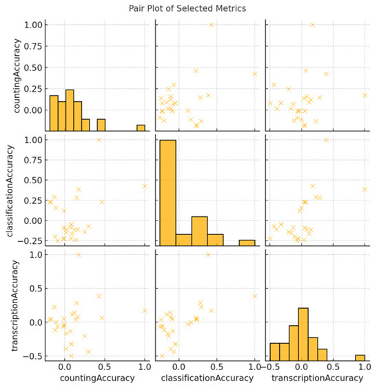 Finally, we analyzed the pair plot graph, as presented in Figure 9, to explore the relationships between a selection of key variables countingAccuracy, classificationAccuracy, and transcriptAccuracy.