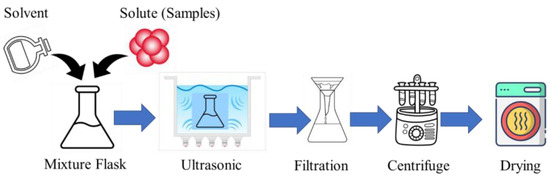 CDs can be synthesized using the ultrasonic method, which is a simple, one-pot, and environmentally friendly approach. The synthesis typically involves dissolving a carbon precursor, like glucose, citric acid, polyethylene glycol, or plant extracts, in a suitable solvent [48,49]. The precursor solution is then subjected to high-intensity ultrasonic irradiation, which induces acoustic cavitation, generating localized high temperatures and pressures that facilitate the carbonization and formation of CDs [48,49,50]. Leveraging the high energy of ultrasonic waves streamlines the synthesis of CDs by eliminating the need for intricate post-treatment procedures, resulting in a straightforward and efficient production route for small-sized CDs [51]. After the ultrasonic treatment, the synthesized CDs are purified using techniques, like centrifugation, filtration, or dialysis, to remove unreacted precursors and byproducts and then isolated through drying methods [48]. The process flow diagram of the ultrasonic-assisted CD synthesis is shown in Figure 2.