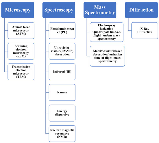 Characterization of CDs is of paramount importance due to the need for understanding their structural, optical, and chemical properties, which directly impact their performance in various applications. Figure 5 presents an overview of several classifications of characterization techniques employed for CDs, which are being discussed in detail below to elucidate their role in unraveling the unique features and functionalities of CDs.