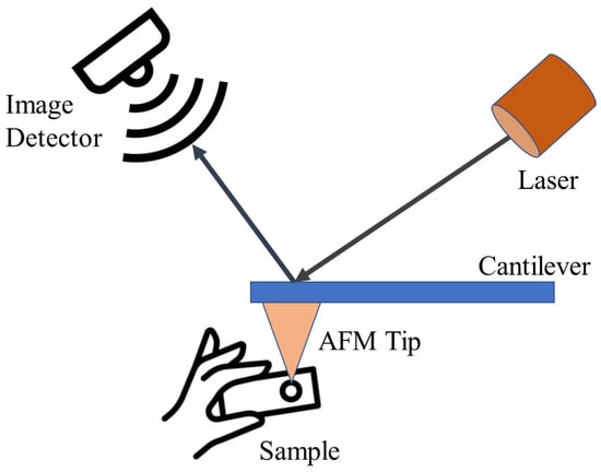 AFM represents a form of scanning probe microscopy renowned for its ability to image surfaces with exceptional resolution, reaching fractions of a nanometer. This resolution surpasses the optical diffraction limit by over 1000 times. AFM operates by employing a sharp tip positioned at the end of a cantilever, enabling it to “sense” and map the surface morphology of a sample through physical contact, in contrast to techniques reliant on light or electrons. The cantilever deflection is measured to generate a high-resolution topographic image of the surface [141]. The general principle of AFM is shown in Figure 6. AFM has a wide range of applications across fields like materials science, polymer engineering, 2D materials, food research, and virology, due to its ability to characterize a diverse set of samples at the nanoscale [141]. In the case of CDs, AFM provides both 2D and 3D information from images of CDs. Particle dimensions are computed by analyzing particle heights in 2D images, while 3D images reveal the CD surface morphology [142,143]. It is a powerful technique that can provide high-resolution, 3D topographic imaging of CDs at the nanoscale, with resolutions lower than 1 nm. AFM imaging can reveal the morphology, size distribution, and even the crystalline structure of CDs [1,144].