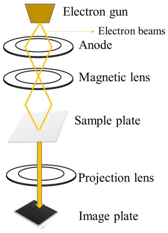 TEM is a powerful microscopy technique that involves passing a beam of high-energy electrons through an ultra-thin specimen. This interaction results in the formation of a high-resolution image, providing detailed insights into the internal structure and composition of the sample at the nanoscale level. The electron beam interacts with the sample, and the transmitted, and scattered electrons are used to generate an image that can resolve details down to the atomic scale, much finer than what is possible with light microscopes [145]. The basic principle of TEM is shown in Figure 7. TEM is an effective method for characterizing CDs at the nanoscale. The produced CDs’ shape and size distribution can be seen via TEM imaging; these images usually display spherical particles with dimensions ranging from 2 to 50 nm [82,146,147,148]. High-resolution TEM (HRTEM) provides even more detailed structural information, allowing researchers to observe the lattice fringes of the CDs and identify their partially crystalline nature [146,147].