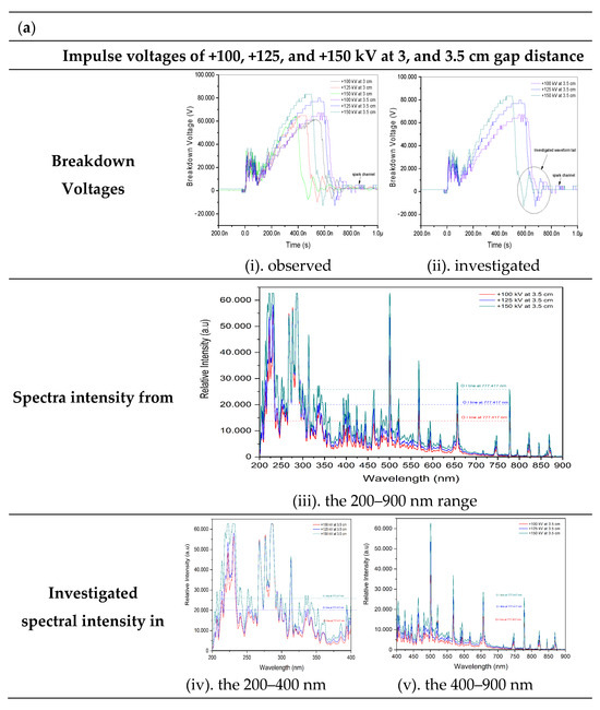 Impulse breakdown voltages in the 200–400 nm, and 400–900 nm spectra. (a) Positive impulse voltages of ±100, ±125, and ±150 kV at 3, and 3.5 cm gap distances; (b) Negative impulse voltages with additional spectra of −100, −125, and −150 kV at 4 cm.