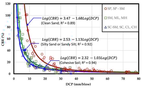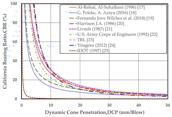 The California Bearing Ratio (CBR) is one of the most important characteristics representing the shear strength of subgrade material in pavement structures. To conduct the CBR test, samples must be transported from the borrow pit, prepared, compacted, and soaked in the laboratory, and then penetrated with CBR equipment. Consequently, a truly representative CBR value is difficult to obtain because it takes a long time and is not readily determined in the field. In addition, civil engineers are often faced with the urgent need for the CBR of soil in a short amount of time. A survey of large amounts of material resources for road construction is a good example. Therefore, in the literature, a number of correlations between CBR and other strength properties of soil, such as density, unconfined compressive strength, and DCP, have been established [1,2,3,4,5,6,7,8,9,10,11,12,13,14,15,16,17,18,19,20,21,22,23,24,25,26,27,28,29,30,31,32,33,34,35]. Among these techniques, one of the tests that can provide a highly reliable correlation with the CBR is the Dynamic Cone Penetration (DCP) test [3,4,13,14,17,18,19,20,21,22,23,24,25,26,27,28,29,35]. In addition, a CBR prediction from multivariate data analysis and/or method of neural network can also provide highly reliable results [36,37,38,39,40,41,42]. However, the multivariate data analysis and neural network method always require input soil parameters that are not already determined in the field. Therefore, DCP equipment, which is considered compact, accurate, and lightweight, is a powerful tool to achieve an efficient onsite correlation between CBR and DCP.
