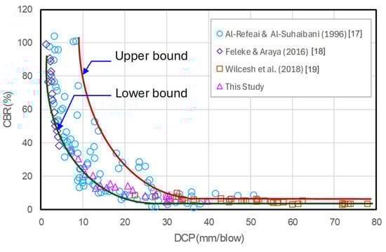 The recalibration process starts by investigating all test results of DCP–CBR from all types of soil. The data points extracted from [17,18,19], including from this study, are depicted in Figure 5 with the upper and lower bound lines. Data points can be divided into two ranges of DCP value: (1) DCP less than 30 mm/blow; and (2) DCP greater than 30 mm/blow. For DCP less than 30 mm/blow, CBR decreased with DCP, and the data points were scattered in a wide range. Within this range, it is impossible to determine a unique correlation. This confirmed that test results from local material could not be used in the CBR prediction without any special conditions. For DCP greater than 30 mm/blow, the CBR varied in a narrow range for all types of soil. Therefore, a unique correlation can be established. This agreed with the finding of Wilcesh et al. [19], who suggested a single equation for describing the DCP–CBR relationship in this range of DCP. In addition, despite having the equation of Wilcesh et al. [19], a constant value of CBR of 6% is enough for the estimation of DCP greater than 30 mm/blow. Moreover, when trying to evaluate the existing correlations presented in Table 1 by four sets of test data, the finding showed that the equation proposed by Wilcesh et al. [19] provided the highest in three cases (i.e., Feleke & Araya (2016), Wilches et al. (2018) and the soil test in this paper), but gave low for data from Al-Refeai & Al-Suhaibani (1996). Table 4 summarizes the described above. The numbers in rectangles represent the considered low value of .