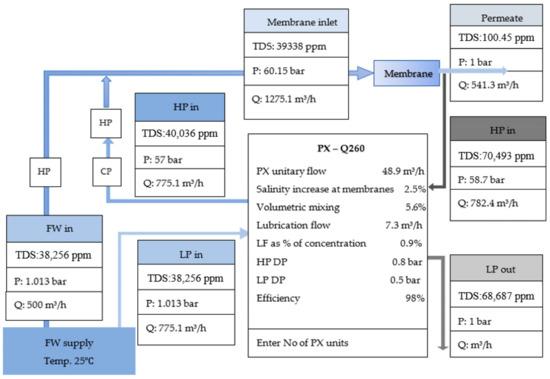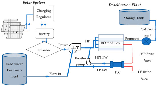 Furthermore, as depicted in Figure 2, the FW is divided into two flows: one flow passes directly through a high-pressure pump (HPP) that elevates the flow directly to the required pressure, and the second flow passes through a pressure exchanger (PX). It is evident that the brine exiting the RO modules possesses a high-pressure (HP) flow. This brine is directed through the PX to transfer its HP to the feed water, which constitutes the alternate flow. Conversely, the FW enters the PX at a lower pressure and exits at a higher pressure referred to as HP1. Subsequently, a booster pump is employed to elevate the pressure of the flow to match that of the feed water before entering the RO modules. To enhance the system’s environmental friendliness [29], a proposal has been put forward to implement a solar power system to operate the booster and high-pressure pump.