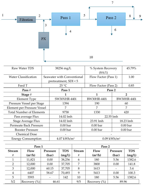 The flow configuration for a membrane system is one or two passes through the system. It is estimated based on experience. Usually, the SWRO (Sea Water RO) system is designed for continuous operation. In our case, a double pass is selected where the 2nd pass is two-staged. After defining the desired parameters, other parameters are classified directly as in Table 5.