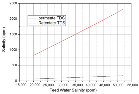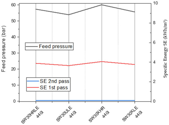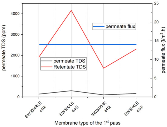 It is noticed that the membrane type has a significant effect on the feed pressure, TDS, and SE in the first pass as can be seen in Figure 11 and Figure 12. Yet, in both the retentate and permeate, the TDS increases. Additionally, it is noticed that the TDS of the permeate and retentate change oppositely to the feed pressure and SE, where the membrane that requires higher feed pressure and SE provides the lowest salinity. This can be explained by the fact that the membranes that require higher pressure have high salt rejection, which provides lower salinity. Additionally, it is found that membrane type does not affect membrane system flux because the flux depends on area and flow rate. However, in our case, all the membranes are of the same area (40.9 m2), and the flow rate is constant.