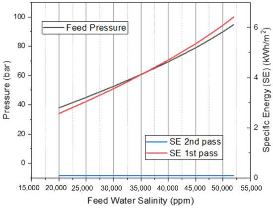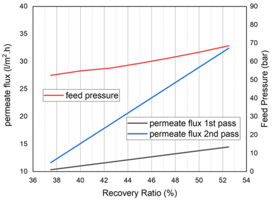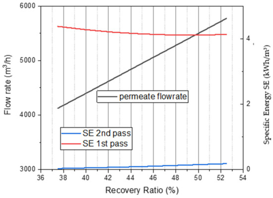 It is noticed from Figure 15 and Figure 16 that as the permeate recovery increases, permeate flux, feed pressure, and flow rate increase. Conversely, SE in the first pass decreases. There is a slight increase in SE in the second pass; this is maybe due to the increase in the permeate flux that requires a higher increase in energy under a constant recovery rate (90%). However, the recovery in the first pass is increasing, so there is a slight decrease in the SE, which means that this increase in recovery compensates for the increase in the permeate flux which results in lower energy consumption.