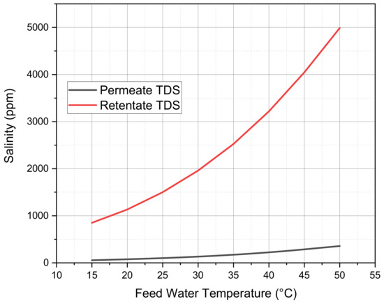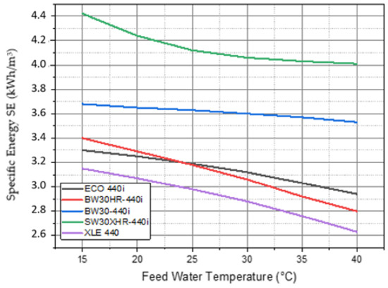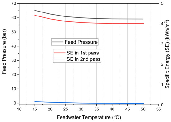 - It is found that the higher temperature of feedwater causes better RO operation, where, as the feedwater temperature increases for a constant permeate flow, feed pressure decreases, and the salinity of permeate increases. Hence, as a result of the lower pressure required, specific energy consumption (SEC) decreases. However, the rate of decrease in FW pressure and SEC depends on the type of membrane used.