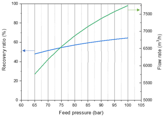 Variation in recovery and permeate flowrate vs. feed pressure at 25 °C FW temp, 38,255 ppm FW salinity, and 12,000 m3/h FW flow rate.