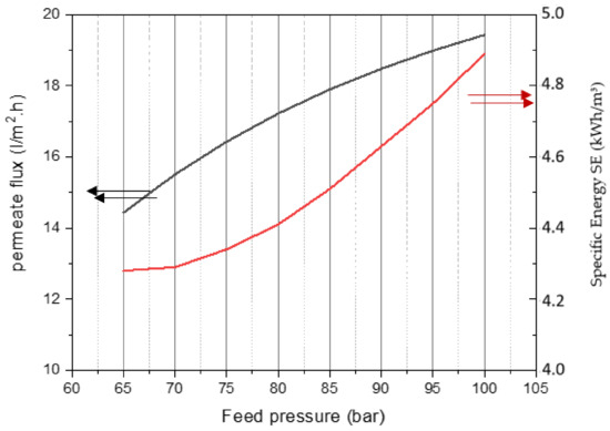 Variation in SE and permeate flux in the first pass vs. feed pressure at 25 °C FW temp, 38,255 ppm FW salinity, and 12,000 m3/h feedwater flow rate.