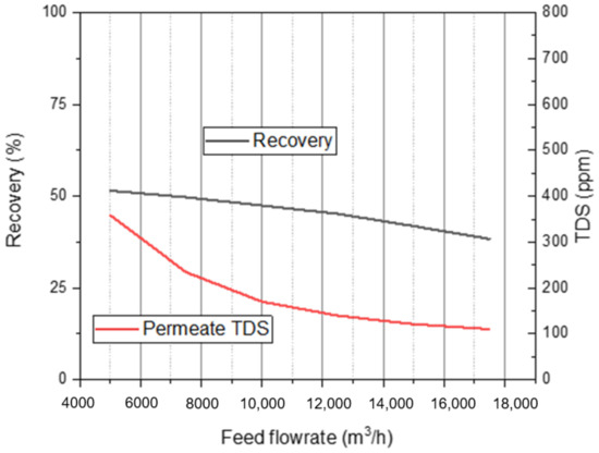 Variation in recovery %, permeate TDS vs. flow rate at 25 °C FW temp, 38,255 ppm FW salinity, and 60 bar.