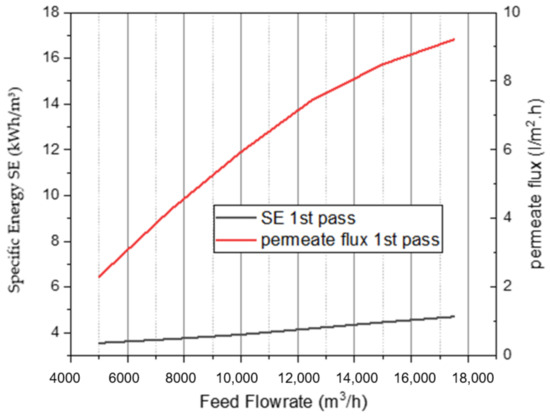 Variation in SE and permeate flux in the first pass vs. flow rate at 25 °C FW temp, 38,255 ppm FW salinity, and 60 bar.