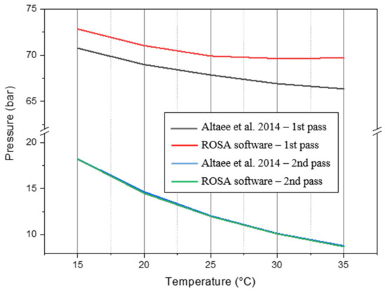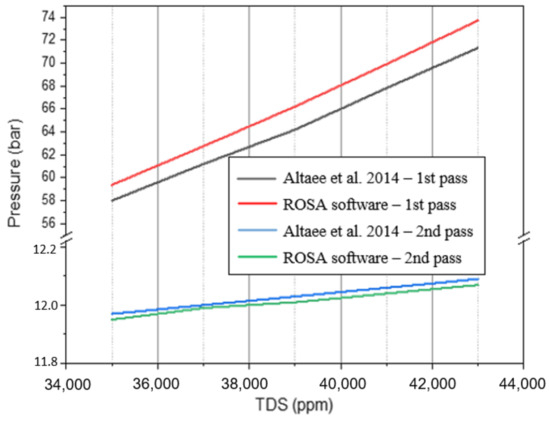 Figure 20 shows that the obtained results have good agreement with those published by Altaee et al. [40] with maximum percentage errors of 5.05% and 1.02% in the first and second passes, respectively. The difference in the results is due to the assumptions that were made and due to the different ROSA versions since using different ROSA versions might result in slightly different outputs [41].