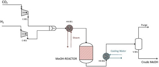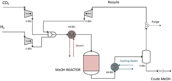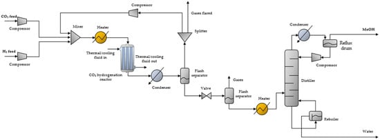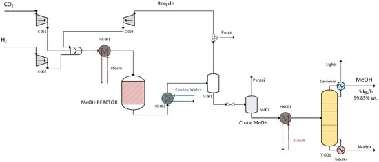 The liquid stream (crude MeOH) was then pre-heated and introduced to the distillation column where MeOH was separated from water and the remaining light components. The distillate product was pure MeOH (99.85 wt%), while the bottom product was mainly water (~99 wt%). The small overhead vapor stream was rejected or flared. MeOH distillation took place at 70–100 °C, while the reflux drum temperature was set at 60 °C. The distiller was also equipped with a reboiler with a base temperature of 50 °C. The CO2 hydrogenation unit is presented in Figure 1.