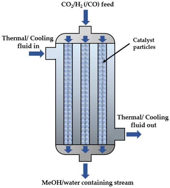 CO2 hydrogenation is a highly exothermic reaction; thus, heat removal is a necessary feature for CO2 hydrogenation reactors. Multi-tubular packed bed catalytic reactors are commonly used for these applications. These reactors consist of multiple parallel tubes where the catalyst is placed and the reaction occurs. Commonly used catalysts are mixes of Cu or CuO, ZnO, and Al2O3. Water or diathermic oil flows between the tubes (reactor shell) to absorb excess heat and can then be utilized in the pre-heating of the reactants, before being cooled and reintroduced to the reactor’s shell. The same fluid can also operate as a thermal fluid, especially during the system’s startup, to bring the reactor to the desired reaction temperature. After startup, heat will begin to produce from the reactions and the fluid must shift to its cooling function. The design of a conventional multi-tubular catalytic reactor is shown in Figure 2.