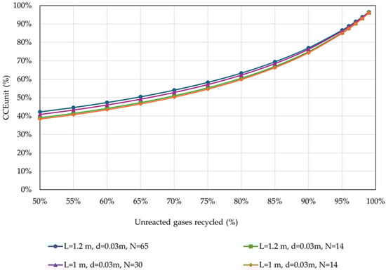 As expected, the electricity requirement decreases with the increase in the recycling rate of the unreacted gases by almost 2 kW or more (0.4 kWh/kgMeOH) for all investigated reactor designs. This reduction is attributed to the lower demand for fresh H2 and consequently fresh CO2, as seen in Figure 8.