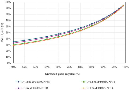 The MeOH yield can be defined for both the reactor and the unit, the two differing due to the fraction of produced MeOH that cannot be collected in the end of the process. This, however, is typically a very small percentage due to unavoidable inefficiencies in condensation, separation, and distillation processes. The difference among the two is negligible and does not provide significant information for the unit’s performance. For the purposes of this study, the reactor’s MeOH yield will not be examined, and MeOH yield will henceforth always refer to overall unit.