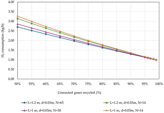 After validating the reactor’s design, the next step was examining the effect of the system’s operational parameters on its overall performance. For all simulations, the percentage of gases flared was fixed at 4%, which corresponds to 96% recycling of unreacted gases.