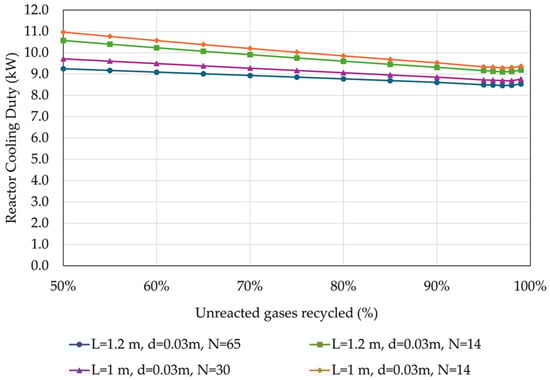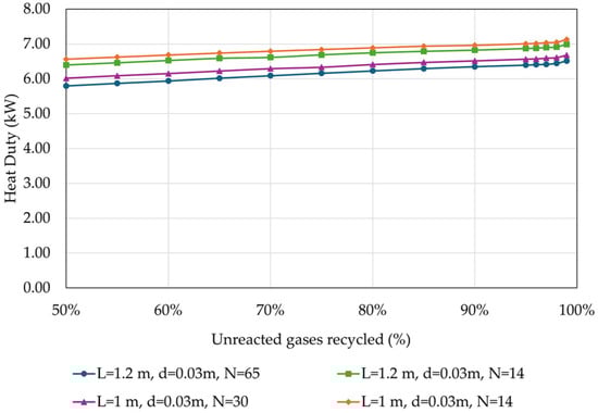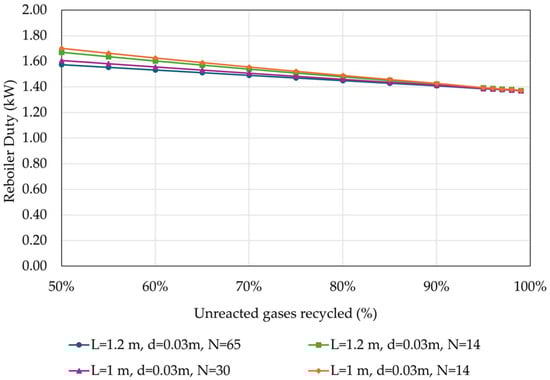 Reboiler duty in relation to the percentage of unreacted gases recycled back to the reactor, for different reactor designs (operational parameters as listed in Table 4).