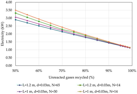 Electricity requirement of the overall process in relation to the percentage of unreacted gases recycled back to the reactor, for different reactor designs (operational parameters as listed in Table 4).
