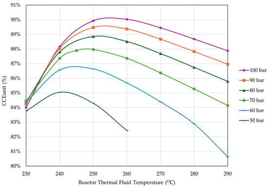 Effect of reactor pressure and thermal fluid temperature on CCEUnit (percentage of unreacted gas flared = 4%, reactor inlet temperature = 210 °C, rest of operational parameters as listed in Table 4).