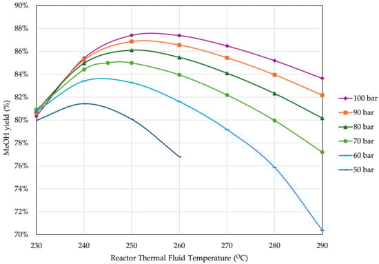 Effect of reactor pressure and thermal fluid temperature on MeOH yield (percentage of unreacted gas flared = 4%, reactor inlet temperature = 210 °C, rest of operational parameters as listed in Table 4).