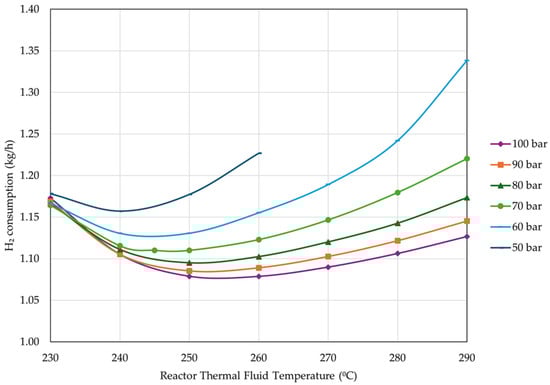 Effect of thermal fluid temperature and reactor pressure on H2 consumption (percentage of unreacted gas flared = 4%, reactor inlet temperature = 210 °C, rest of operational parameters as listed in Table 4).