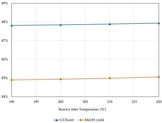 Effect of reactor inlet temperature on CCEUnit and MeOH yield (percentage of unreacted gas flared = 4%, rest of operational parameters as listed in Table 4).