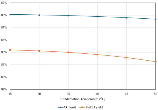 Effect of condensation temperature on CCEUnit and MeOH yield (percentage of unreacted gas flared = 4%, rest of operational parameters as listed in Table 4).
