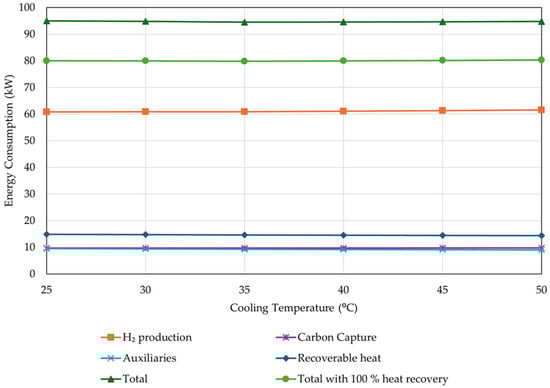 The results showed that when ranging from 25–50 °C, condensation temperature does not significantly affect the CCEUnit and MeOH yield (the difference is less than 1%). This indicates that condensation temperature could be kept at maximum to reduce the cooling duties. However, higher condensation temperatures result in slightly higher H2 consumption. In order to evaluate the optimal condensation temperature, the total energy requirements, including all auxiliaries, H2 production, and carbon capture were examined and presented in Figure 18. An average of 55 kWh/kg was considered for H2 production through water electrolysis, while an average of 1.2 kWh/kg CO2 was considered for the post-carbon capture unit. The recoverable heat from the suggested MeOH production system was also considered, to examine the theoretically possible lowest energy consumption.