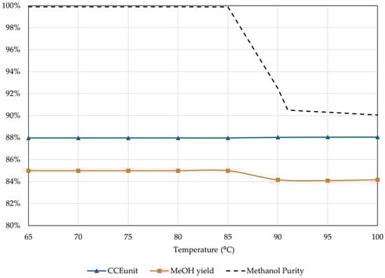 Effect of distillation temperature on CCEUnit, MeOH yield, and purity (percentage of unreacted gas flared = 4%, reactor inlet temperature = 210 °C, thermal fluid temperature = 250 °C, rest of operational parameters as listed in Table 4).
