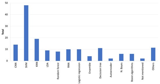 It is found that support vector machine (SVM) is the most popular technique used with around 30.57% of the works. It can handle nonlinear data using kernel functions, allowing complex relationships between features to be represented and improving the classification accuracy [111]. Then, the K-nearest neighbors (KNN) algorithm presents about 12.1% of usage according to the literature. This finding is noteworthy as both methods are supervised training algorithms commonly employed in ML for classification tasks.