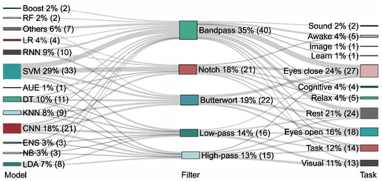 The above highlights the relevance of tasks, specifically resting with eyes closed at 58.67%, as a fundamental strategy for acquiring EEG signals. This highlights the importance of these controlled conditions to obtain and record more precise and consistent brain signals to evaluate more precise patterns for feature extraction. According to [84], these activities evidence the synchronous activation of multiple cortical neurons that coordinate to produce signals of considerable amplitude.