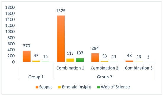 Figure 2 shows the results found in the respective databases. From this figure, it is possible to see that the database that returned the highest number of articles was Scopus. In addition, combination 1 of Group 2 returned the highest number of articles. This highlights the relevance of the Scopus database in research and points to a focus on studies related to thermal comfort.
