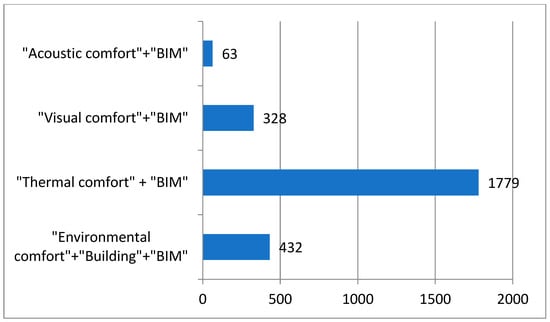 Based on the research carried out, the number of articles found was lower than expected. Figure 3 shows the number of articles found in the databases searched. The combination with the highest number of articles was “thermal comfort” + “BIM”. The relevance of this topic calls for more studies to be carried out, given that the number of buildings is increasing along with concerns about sustainability and comfort in the environment.