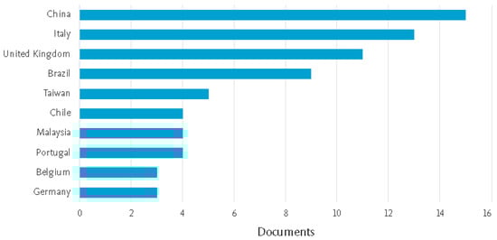 The articles included herein came from 75 countries. Figure 4 shows the distribution of the articles analyzed from the Scopus database by their various origins, highlighting China as the largest source of information on the subject. It is also important to note that only articles in English were considered, which may have had a direct impact on the research results.