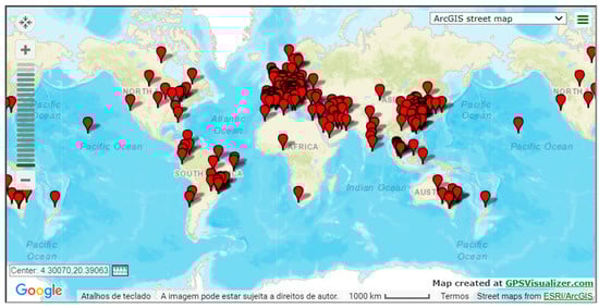 The tool was used to generate a map containing the countries of origin of the articles extracted from the bibliometric review. Data such as author affiliations, titles, authors and the locations of the institutions were downloaded from the databases used in this article. The file was edited, leaving only the articles’ countries of origin. These data were loaded into GPSV, where they were processed and a global map was generated. The tool allowed clear visualization of the geographical distribution of the articles, highlighting the countries with the most scientific production in the area of study, which makes it easier to identify global patterns and trends in research.